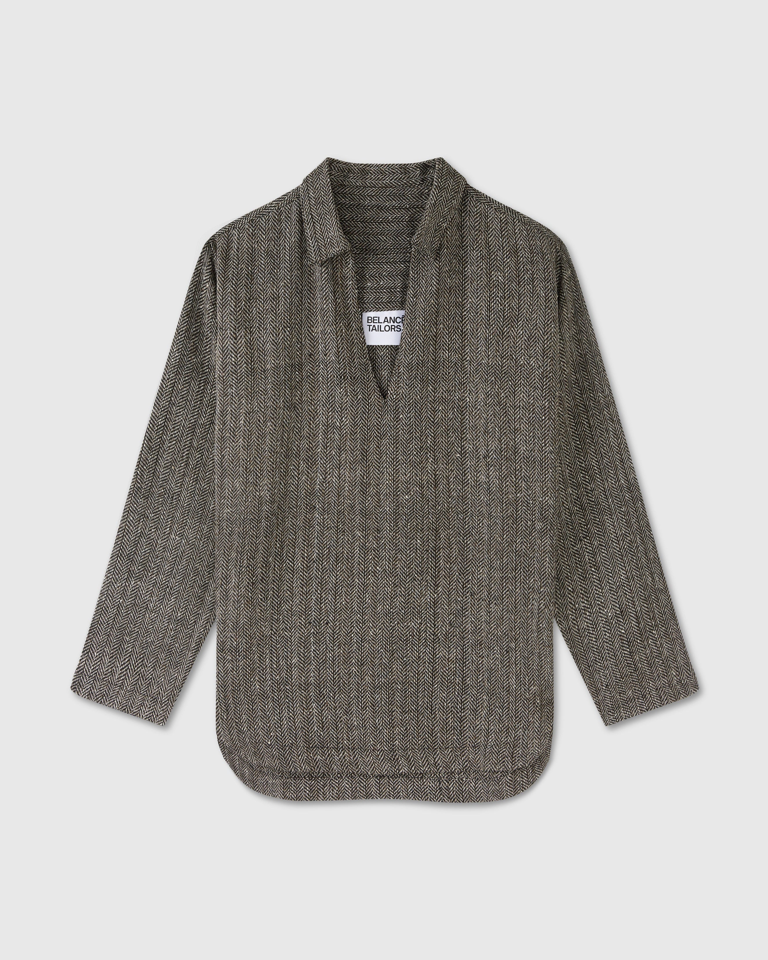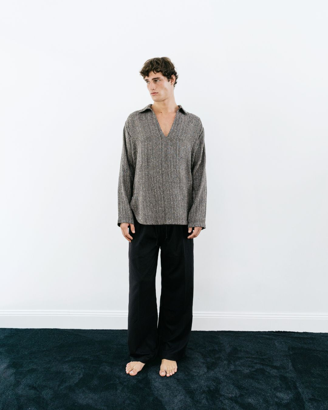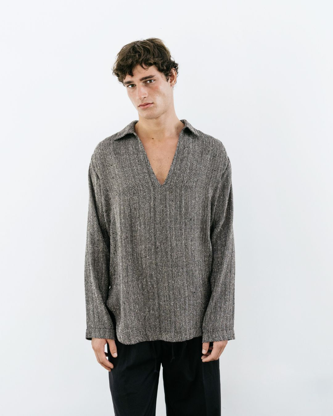 A relaxed deep V-neck shirt crafted from intricate hand-loomed silk, delicately woven by master artisans in a herringbone pattern. Due to the rarity of this fabric, this exclusive piece is available in very limited quantities. Designed for versatility, it can be worn effortlessly casual or styled with a tailored trouser for an elegant summer event look.