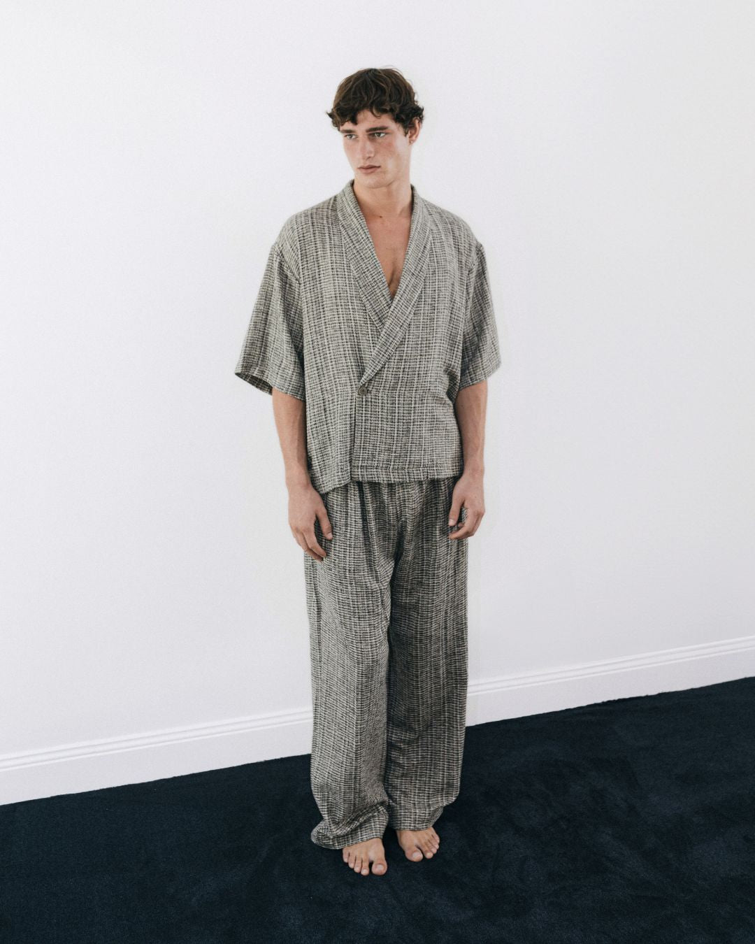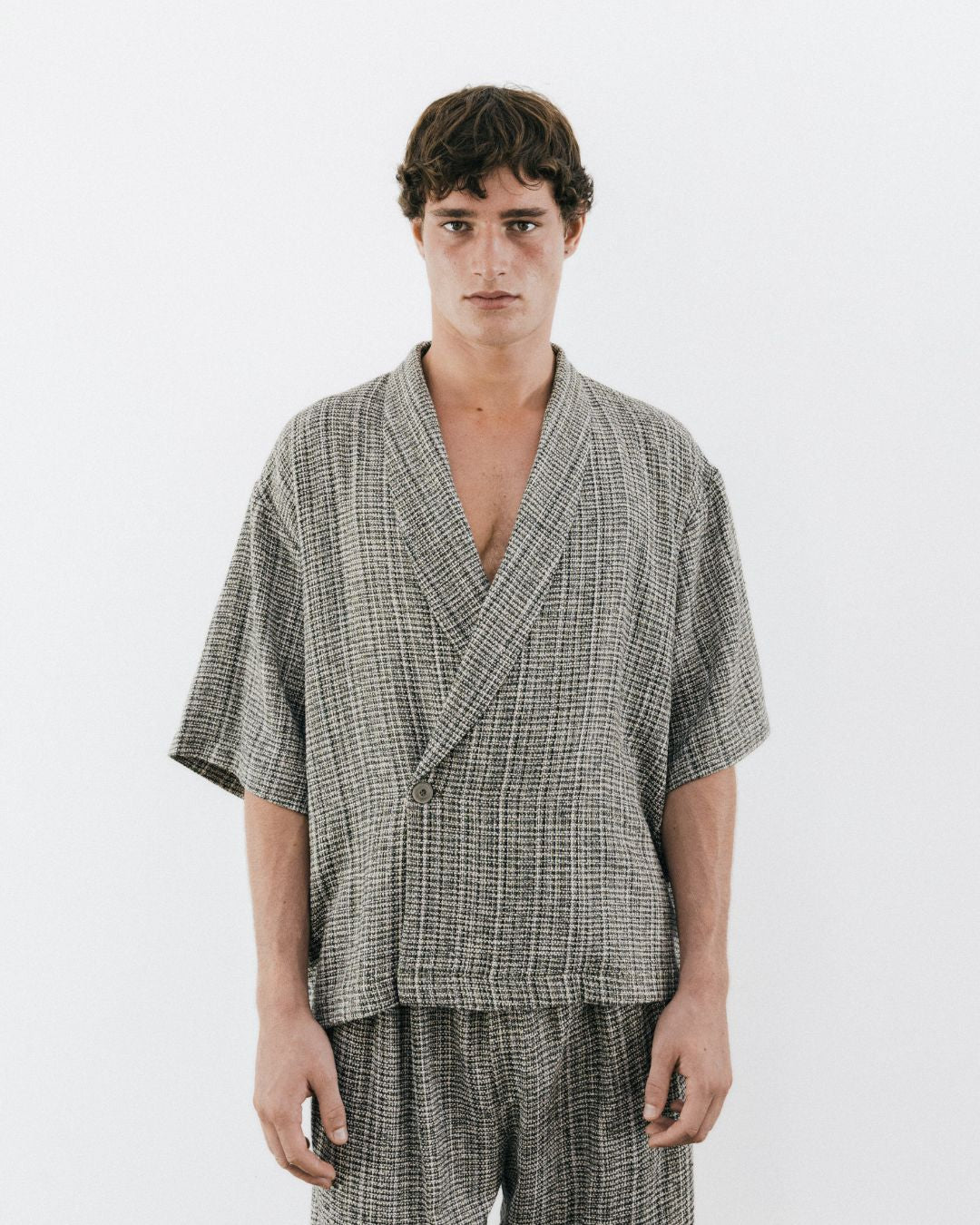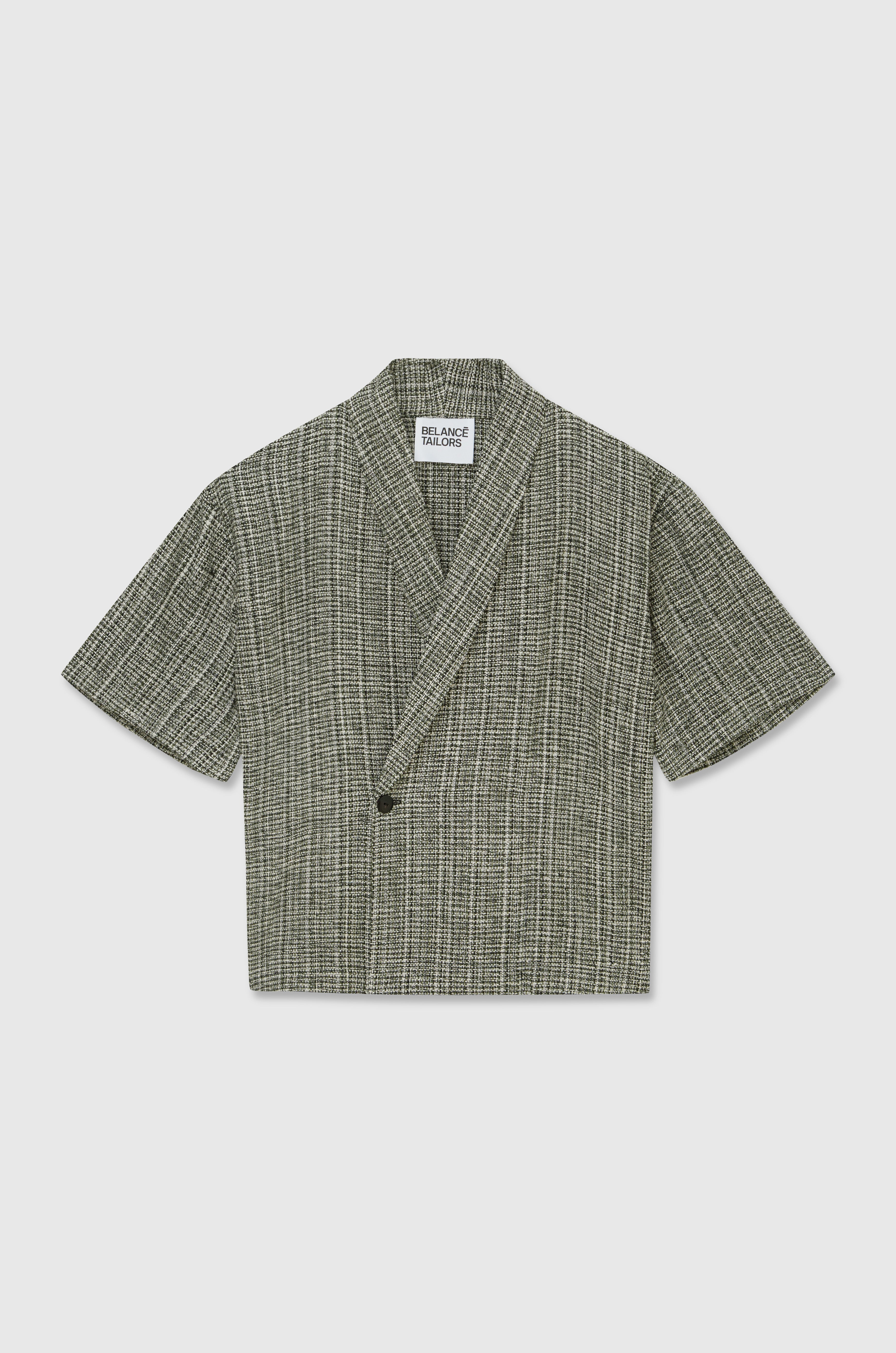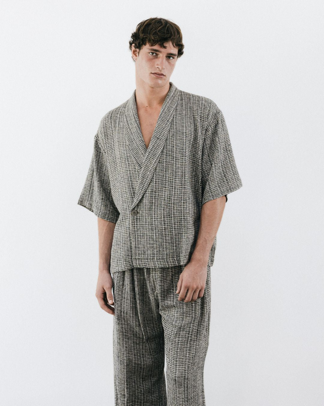 A relaxed and luxurious double breasted shawl lapel jacket with short sleeves. The handwoven fabric is made as an open weave to allow air to flow naturally. Wear it casually or to relaxed summer events. This jacket is also part of a set, find the matching trousers here.