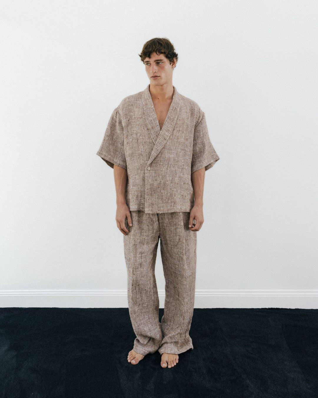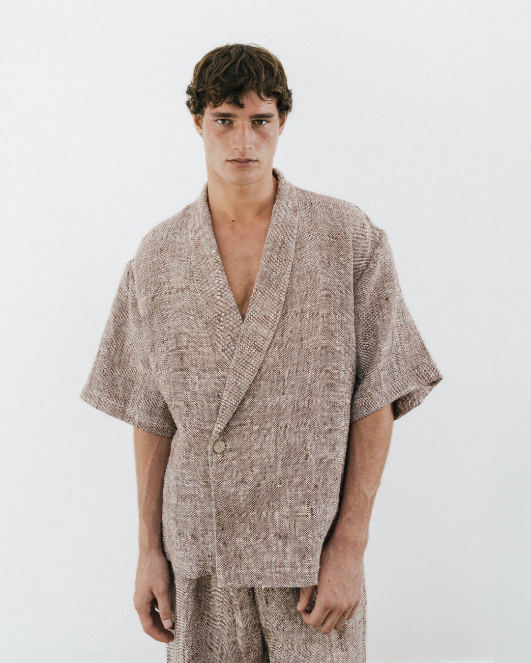 A relaxed, Japanese-inspired double-breasted shawl lapel jacket with short sleeves, beautifully crafted from heavy hand-loomed linen by master artisans. it pairs effortlessly with jeans for a casual look or can be styled with the matching trousers for relaxed yet sophisticated summer events. Complete the set with the trousers, available here.